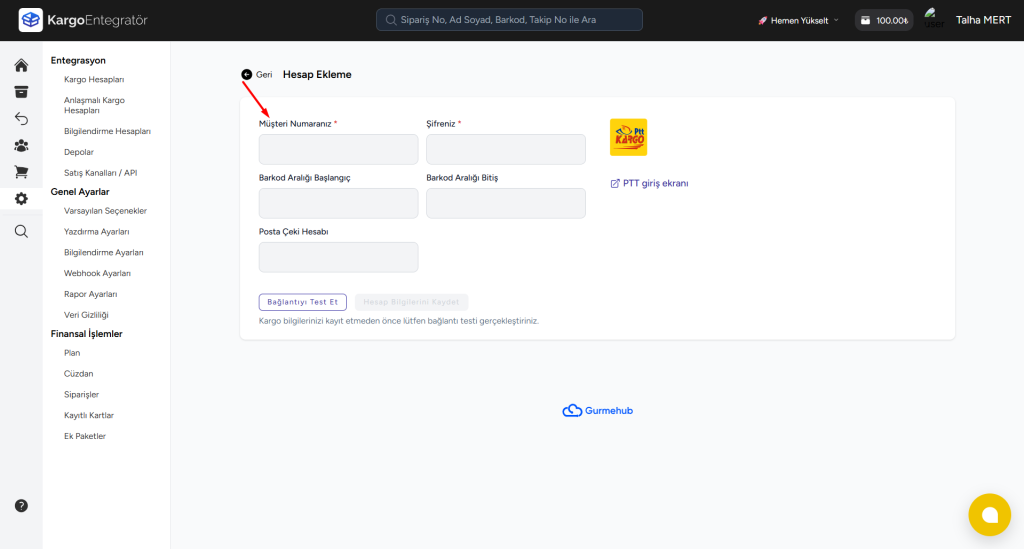 4-) PTT Kargo paneline giriş için kullandığınız bilgileri ilgili alanlara giriniz.